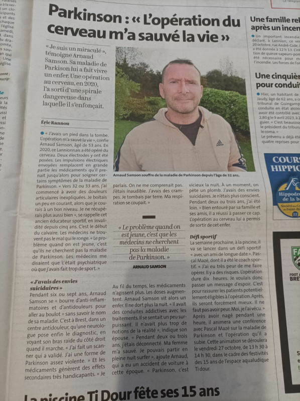 Il précise : "je suis atteint de la maladie de Parkinson depuis 20 ans et après avoir été très mal je revis grâce à l'opération".