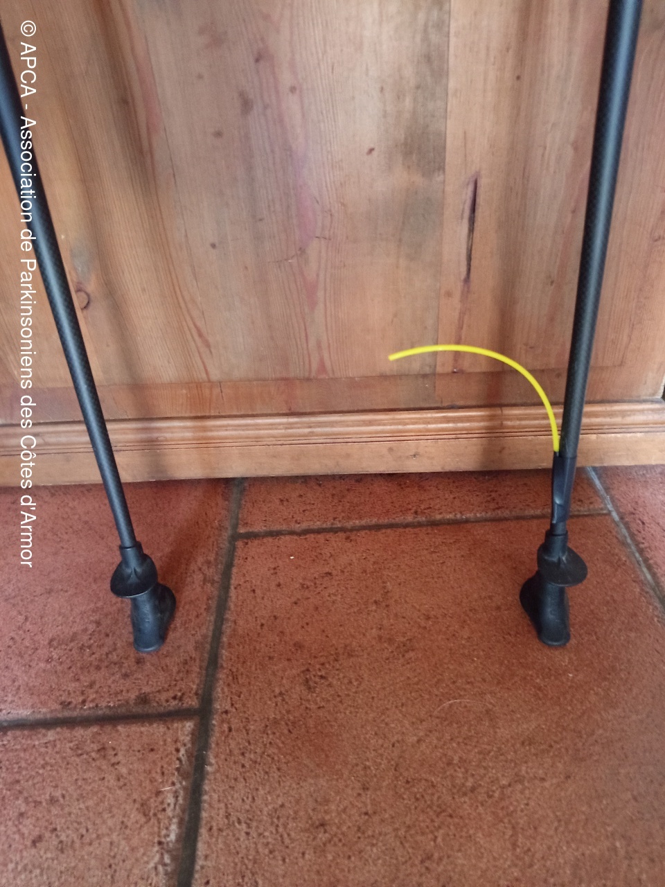 2) Je regarde le fil et je le touche du pied (= mouvement volontaire en espérant de ce fait supprimer le freezing, sinon recommencer ou trouver une autre idée de mouvement volontaire : tourner la  tête, lever le bâton, etc. De toutes façons, se rassurer car le freezing n’est que momentané).